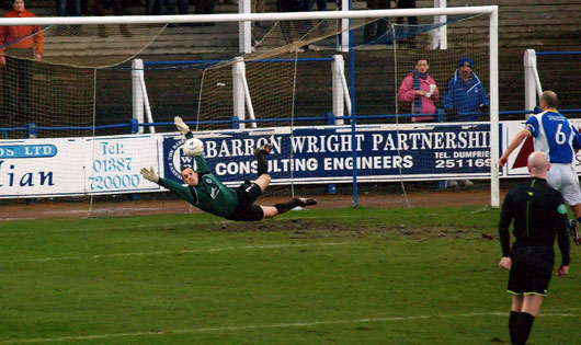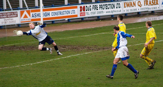On the most miserable of days in Dumfries with torrential rain, blustery wind and winter like temperatures an end to end pulsating match that echoed the classic 6-5 game of a few years back was anticipated. However the game that was served up bore more resemblance to the weather than to a classic game of football. The proceedings were undoubtedly hindered by the weather as both sides struggled to put more than a couple of passes together and neither goalkeeper had much to do bar a couple of saves each in the full ninety minutes.