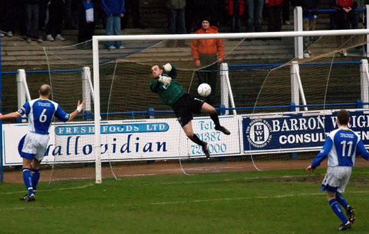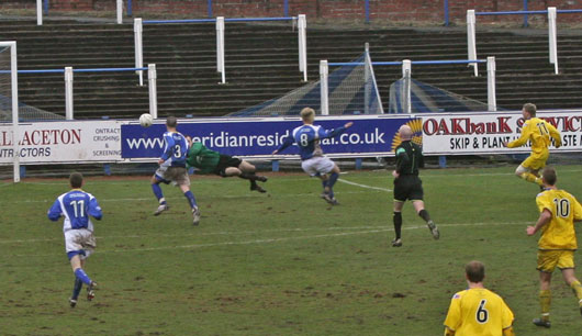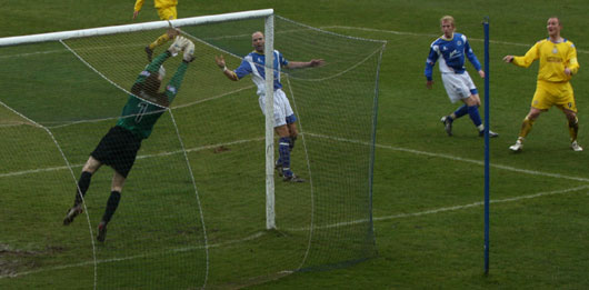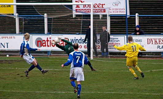 Once again Paul Burns was the man getting into the dangerous areas and within ten minutes of the start he got himself into the box and whipped in a cross come shot that almost made it past Robinson to the prowling McCann, however the keeper managed to hold on. Both Bob Harris and Neil Macfarlane found themselves in the referee's book before Ryan McCann had a direct shot on goal that Robinson again comfortably held.