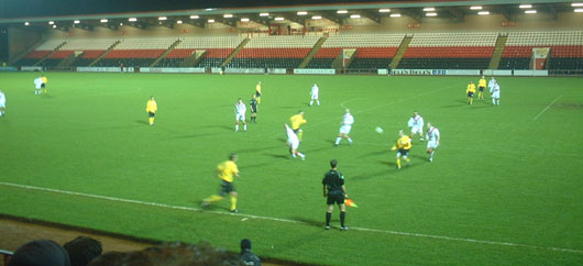On 77 minutes Craig was maybe a little lucky to escape a booking for a late lunge at Gow which saw him receive lengthy treatment. A couple of minutes later though Stephen Docherty did receive a caution for a late challenge on McLaughlin despite the Airdrie management's attempts to substitute him before the referee could produce the card! He was then replaced with Willie Wilson. The final few minutes though saw a succession of good Queens chances which were enough to win three games!. First Lyle's right sided cross was tipped away by McGeown as McNiven awaited an easy nod into the empty net if the keeper didn't get there. From the resulting corner McGeown got completely lost and ended up on the ground as the ball presented itself at David Craig who should have scored. However, Craig's control let him down and the ball was scrambled away only as far as Lyle who's header at goal was nodded off the line by Owen Coyle of all people. A change for either side on 85 minutes saw Jaconelli replace Lyle for Queens and Dunn replace Gow for Airdrie. With two minutes remaining a fine passing move saw Queens suddenly three on one but Jaconelli opted to shoot himself from the edge of the box rather than play in a colleague. His shot was a good one though and forced a fine block out of McGeown. Bowey then missed a sitter of a rebound but was given offside anyway. A minute into injury time more good passing cleared Bowey into the box but, forced wide, his shot across the face of goal failed to trouble the net. On 92 minutes a fine pass from Jaconelli allowed McNiven a clear run at McGeown but whilst his shot beat the goalkeeper it also bent away from the bottom left corner and narrowly missed the target. An odd game at the end of the day. For me Airdrie played better than this at Palmerston and lost. We played worse than this that day and won! Over 90 minutes the home side probably played the better stuff and probably deserved their win. However, for spells we pegged them back and probably had more good chances over the period albeit most of them arrived inside the final ten minutes. On a night like this the first goal was always going to be crucial and, once they got it and McLaughlin failed with a great chance to equalise straight away, it was always going to be difficult to get a result. Airdrie leapfrog above us with the win and drop us to 6th for the first time in a fair while albeit we have that game in hand. Wins tonight for Partick and Ross County close the table right up again also and it's certainly crucial we don't lose to Hamilton on Saturday. Ewan Lithgow Photograph - David Gow |