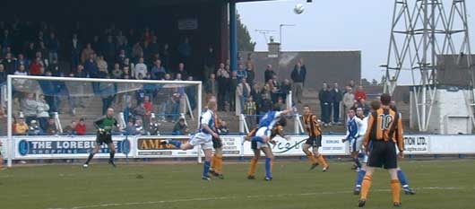 Despite the frenetic start it did take almost twenty minutes for a chance on goals to be generated, a free-kick from the right was floated across and onto Jim Thomson's head, his flick was almost diverted into the net by Derek Lyle. Queens then began to dominate play but any decision that was going seemed to be going the English sides way as Craig Feroz was awarded a decision on the edge of the box as he appeared to trap the ball on the floor, the resultant free kick shot past the post and Queens continued on their way forward.