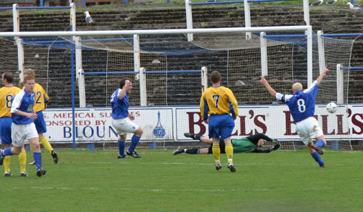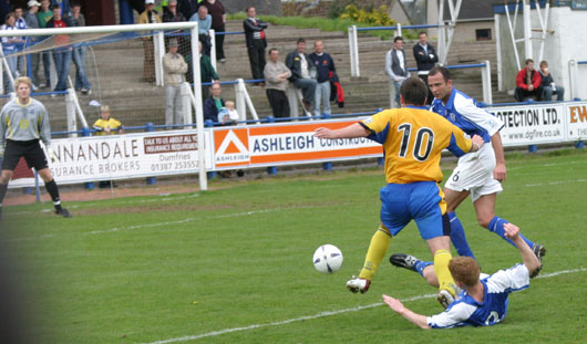 The match itself began in a purposeful manner and it was the Perth Saints who could have taken the lead in just ten minutes as Tommy English failed to clear at the back of the 6 yard box, th ball fell to former Queens midfielder David Bagan and his effort looked like being a goal until Richie Barnard pulled off a tremendous block to push the ball away.
