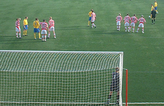 Gradually though Queens played themselves back into the game. On 35 minutes McCaffrey's decent cross was fumbled by Jellema under pressure from Barrowman and smuggled out for a corner. From the resulting kick which was far too deep Willie Gibson played the ball back in and Scally headed down for O'Neill to strike a flying volley narrowly wide of target. Jim Lauchlan picked up the game's first booking for a quite cynical trip on Offiong who was past him just inside our half four minutes before the interval but on the stroke of half time Queens found themselves level. Willie Gibson somehow found possession on the edge of the Hamilton box and hit a perfect chip for the top right corner of goal. Jellema couldn't quite reach it with his first hand but swung his other one over to make a spectacular tip wide. The danger was averted only temporarily though as the corner was played deep and then Gibson's cross back in was fell perfectly for John O'Neill to bullet a header home.