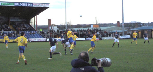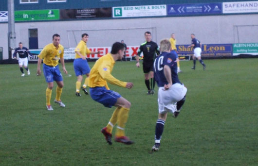 Queens attempted to bounce back and in 36 minutes County survived a penalty appeal when Weir appeared to be barged over in attempting to get on the end of an O'Connor flick into the box. However, it was County who came closest to a goal a minute before the break when Jim Thomson beat Higgins to the ball but cleared the ball against the County man with the loose ball springing Martin Scott clear. This time it was Hinchie to the rescue though with a fine block at the expense of a corner. From the resulting set piece Lee Wilkie's header went narrowly past. |