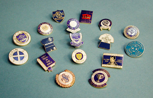 Over the seasons there have been a number of enamelled badges available for Queens fans, but has anybody got a definative full set, well maybe this is the collection that comes closest, the badges shown belong to Queens programme editor Bruce Wright and contains twenty six in total,(multiple versions of some shown), with the oldest being sixty seven years old, there is another badge that is known of but it presently resides in Dumfries Museum. Does anyone know of any others? if so let us know.